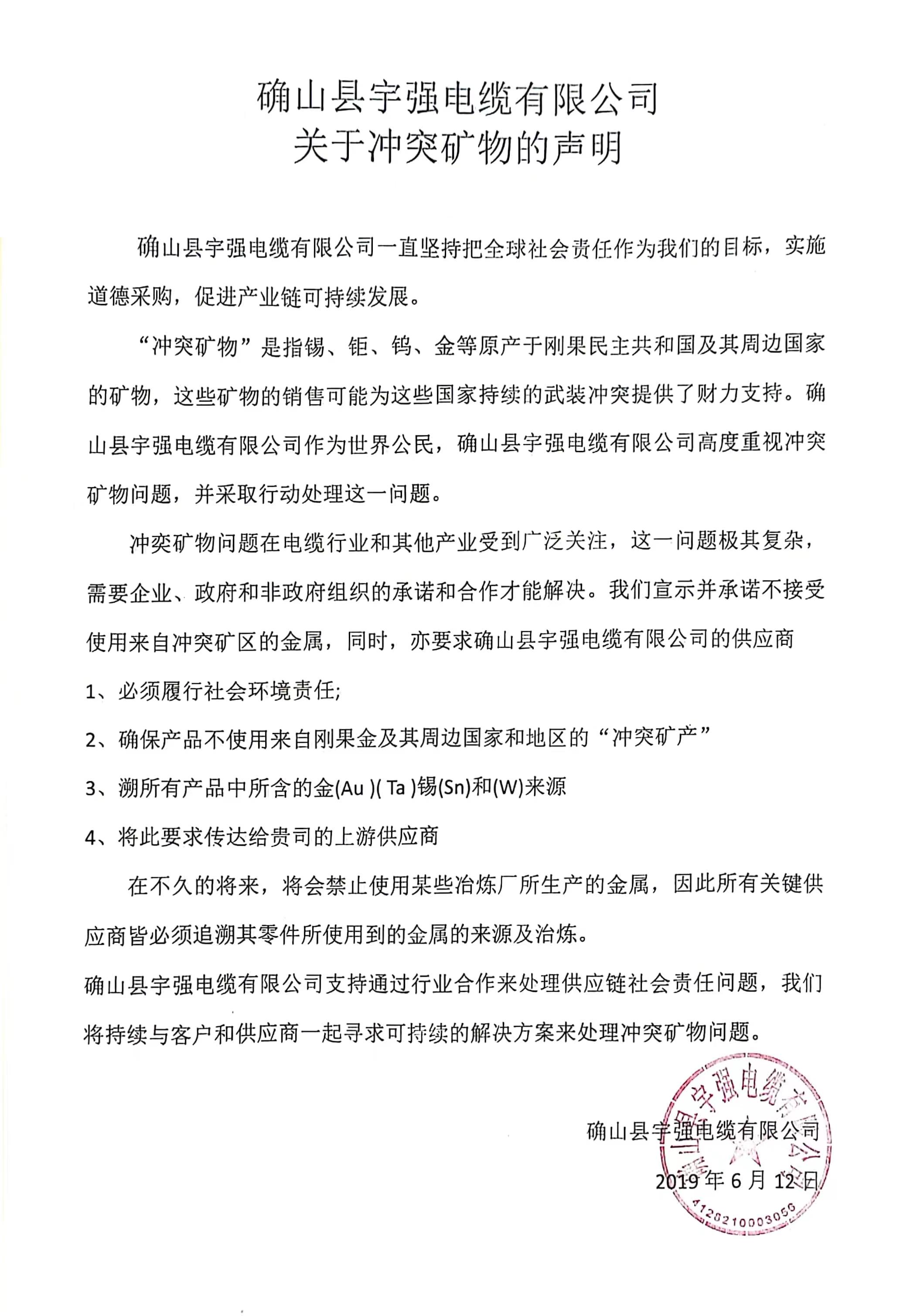 确山县宇强电缆有限公司 关于冲突矿物的声明